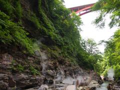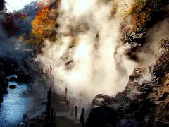 皆瀬地区にある「小安峡温泉」の名所のひとつで、高さ60mの渓谷の底、切り立った岩盤の間から熱気と蒸気が激しく噴き上げている。1時間に約10t、98度の湯が噴き上がる様子は迫力満点。小安峡一帯は渓谷美の美しさでも知られ、春は新緑、秋は紅葉、冬は峡谷に下がる大きなつらら「しがっこ」を楽しむことができる。