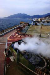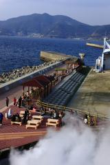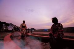 小浜温泉の海沿いにある長さ105mの日本一長い足湯。源泉は100度を超え、湯棚からは湯けむりが立ち上る。「ウォーキング足湯」では、底に埋め込まれた小石の上を歩いて足つぼマッサージができるほか、愛犬と一緒に足湯を楽しめる「ペット足湯」もある。「蒸し釜」では、持ち込んだ食材を蒸して食べることができる(蒸しカゴ/有料、蒸し釜/無料)。腰かけてゆったりと足湯につかりながら眺める、海に沈みゆく夕日は格別。