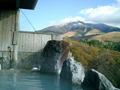 岳の湯温泉のコバルトブルーのにごり湯と、正面に望む湧蓋山の絶景が楽しめる温泉施設。源泉温度が100℃近くある温泉は、4本のタンクで自然に冷ました状態でそのまま浴槽にかけ流しに。浴場は男女それぞれにある露天大浴場に、家族風呂6室、屋根付きの半露天の家族露天風呂6室、檜の香りがよい檜風呂露天5室と多彩。大浴場以外の浴室の利用はコイン式の貸切風呂で、使用の際に毎回湯が入れ替えられる仕組みになっている。日帰り入浴者も無料で利用できる地獄蒸しの蒸し釜が10釜もあり、売店で食材を購入して是非地獄蒸しを体験したい。