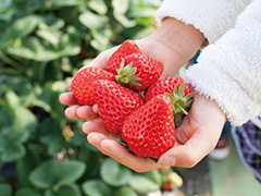 90棟のハウスがある静岡伊豆半島最大規模の農園。静岡県生まれのイチゴ・章姫は、ひと口では食べ切れないほど大きくてジューシー。さわやかな甘さで、制限時間ギリギリまでお腹いっぱい食べたくなるほど、飽きないおいしさだ(章姫のほか、紅ほっぺもある。品種の選択は不可)。また、3月中旬頃までの入園者には、無料の食用菜花の摘み取りサービスあり(なくなり次第終了、天候により摘み取れない場合がある)。