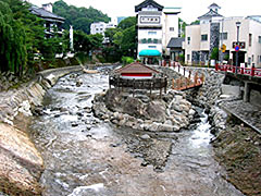 桂川の河原に位置し、周囲の景色に溶け込むような湯小屋が印象的な名所。昔、弘法大師が仏具の独鈷で岩を砕き、温泉を湧出させたという伝説が残る、修善寺温泉のシンボル。入浴は不可。