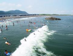 明治18年(1885年)、初代軍医総監を務めた松本順によって開設された海水浴場。海岸から10m沖合いに浮かぶ「かぶと岩」がシンボル。真夏の休日を過ごすのに最適で、7月~8月のトップシーズンには、県内外から多くの海水浴客が訪れる。2025年は、海水浴場開設140周年を迎え、週末にはさまざまなイベントを予定している。