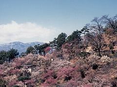 JR酒折駅に程近い山梨県屈指の梅園。不老園は明治30年(1897)に呉服商・奥村正右衛門の別荘としてつくられたもの。甲府盆地の東部にあり、総面積約5万平方mの園内には、約30種類、約2000本の梅が咲き誇る。整備された遊歩道沿いには、長生閣や喜楽庵の庵や、園内で採れた梅の実を使った梅漬けなどを販売する売店、菅原道真公を祀る梅天神があり、展望台からは花の向こうに富士山や南アルプスを一望できる。桜や南天、ツツジ、紅葉、牡丹なども栽培され散策に格好だ。