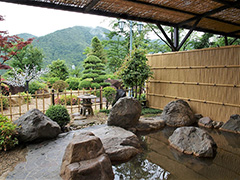 大阪のてっぺん能勢の里山に立つ料理旅館。温泉は日帰り客も利用できる。大浴場は段差が少なく、すっきりとした空間。露天風呂は日本庭園を眺めることのできる落ち着いた雰囲気だ。