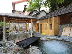 泉源地にある下呂温泉の多目的温泉保養館。広々とした露天空間には露天風呂に加え、東屋の下に三温の湯や打たせ湯、箱蒸し、ジャクジー、泡沫浴などが配置されている。白鷺乃湯・温泉博物館とのお得な共通入場券もあり。