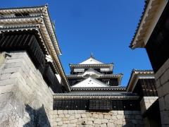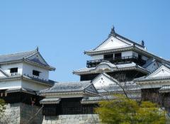 松山市の中央、標高132mの勝山山頂に本丸があり、裾野に二之丸、三之丸がある日本有数の平山城。天守は、日本で最後の完全な城郭建築と言われており、最上階からは、360度眺望が開け、松山平野や瀬戸内海などを見渡すことができる。現存する、江戸期以前に建築された12天守の1つであり、21棟の建造物が、国の重要文化財に指定されている。