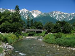 白馬三山を背に、清流、姫川にかかる吊橋。北アルプスの山々や茅葺屋根の民家と見事な調和を成す一幅の絵のような風景は、見る人の心を魅了し、フォトやスケッチのベストスポットとして人気を集めている。雪解けの山野草、緑まぶしい夏、紅葉に染まる山々、白銀のウインターシーズンと、大出の吊橋もまた四季折々に豊かな表情を見せる。