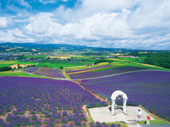 7月中旬~下旬のラベンダーの開花時期には、4.2haの丘陵地いっぱいが紫色に染まる。頂上の展望台からは、色あざやかなラベンダー畑はもちろん、十勝岳連峰の山並が眺められ、ロケーションは抜群。おすすめの撮影ポイントは、展望台前の「愛の鐘」。