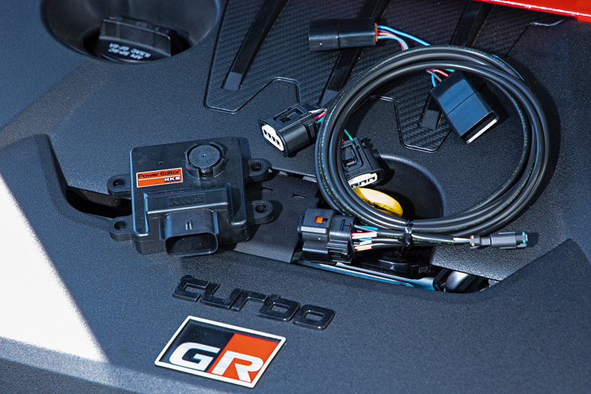 ストリート仕様は、エンジンやタービンもノーマル。HKSでは、手軽にブーストアップが楽しめる、パワーエディターというアイテムもリリースしている。パワーチューンに興味のあるGRヤリスユーザーは必見!