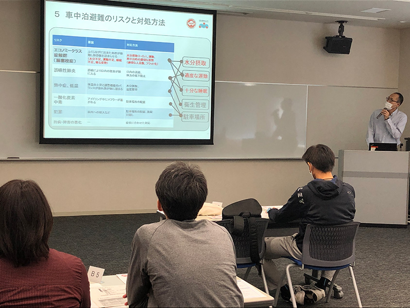 そしてこのプログラム最大の特徴である車中泊避難は、災害時の車中泊に関する知識が学べる非常に珍しいカリキュラムとなっている。「車中泊の知識?」と思う人もいるかもしれないが、レジャーでの車中泊とは異なり、災害時は緊張や不安などを抱えながら、かつ準備がない状態で突然必要にせまられての車中泊となる。