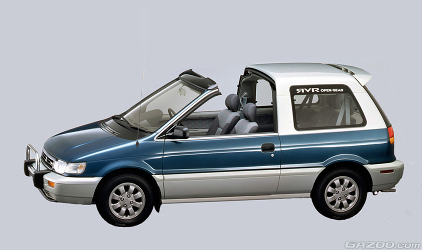 そのRVRに1993年に追加されたバリエーションがオープンギア。ボディー剛性を保つべくボディーを3ドア化し、前席ルーフ部分を電動スライド式としてオープンエアドライビングも楽しめる仕様とした。こちらも駆動方式は4WDとFF、変速機は5段MTと4段ATが選択可能だった。SUVのバラエティー化を先取りしていたモデルといえるが、さすがに需要は多くはなかったようで初代のみで終わり、2代目以降のRVRには設定されなかった。