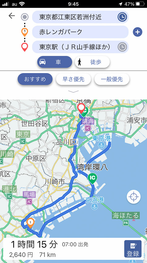 無料で誰もが手軽に使えるカーナビアプリという意味ではGoogle マップが代表的です。ただ、Google マップは汎用的な地図アプリをベースにしているので、必ずしもドライブ向きとは言えないところもあります。例えば案内表示が最小限しかなく、クルマでは通行が困難な細い道が案内されてしまうケースも少なくないようです。