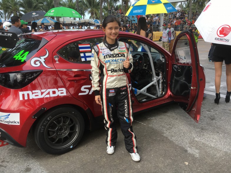 マツダは「Mazda Women in Motorsport Project」を展開していますが、その一環としてタイ人女性ドライバーのバックアップも行っています。この方はプロイ選手。タイスーパーシリーズのスーパーコンパクトクラスに参戦中。2016年には来日し、マツダの美祢テストコースで同プロジェクトの訓練を受講した経験もお持ちです。