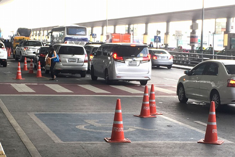 2重駐車はいただけませんが、車いす利用者用スペースはカラーコーンでわかりやすく区切られるとともに、一般車両はだれもそこに侵入しません。