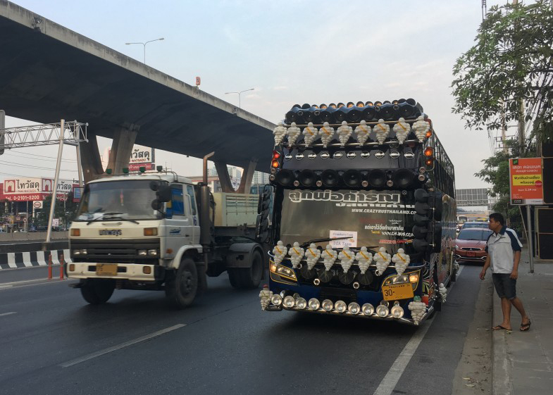 フロントガラスにcrazybusthailand.comというURLが書いてありますが、今回の取材をコーディネートしてくれたタイ人のナットさんによれば、ド派手なバスのデコレーションを楽しむグループがあるそうで、結構はやっているそうですよ。