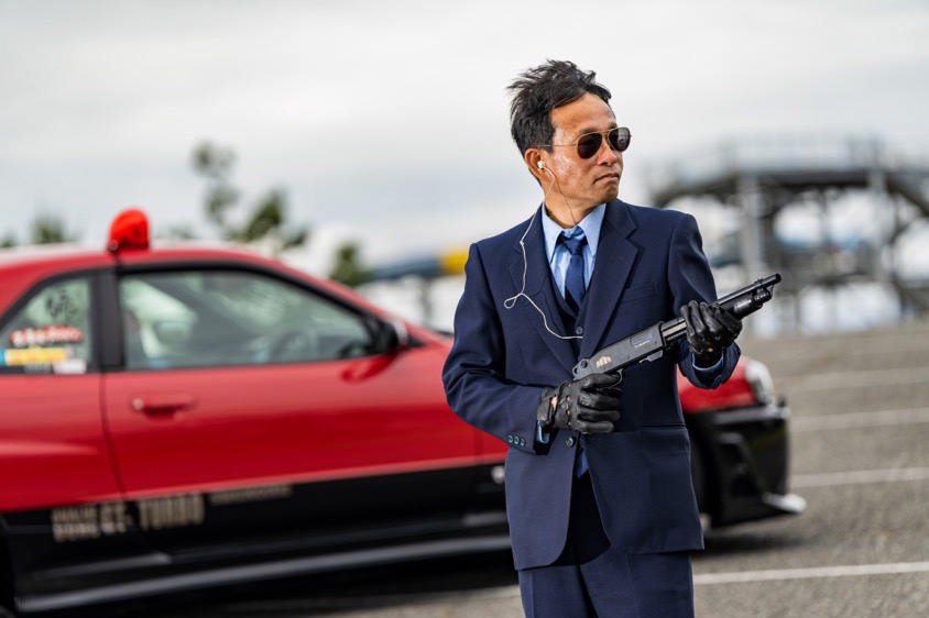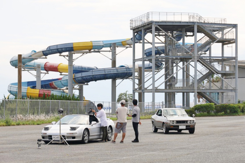 大磯ロングビーチのウォータースライダーをバックに愛車取材を行う