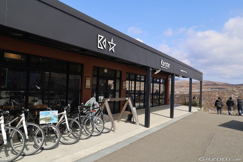 360度のパノラマビューでカルスト台地を一望できる展望台は、ひっきりなしに観光客が訪れる人気スポット。展望台の隣にあるMine秋吉台ジオパークセンター『Karstar(カルスター)』は、無料の休憩スペースや観光案内所などが併設されていて、散策を楽しむ途中の休憩や、レンタルサイクルを借りてカルストロードを散策するための拠点としても活用できる。