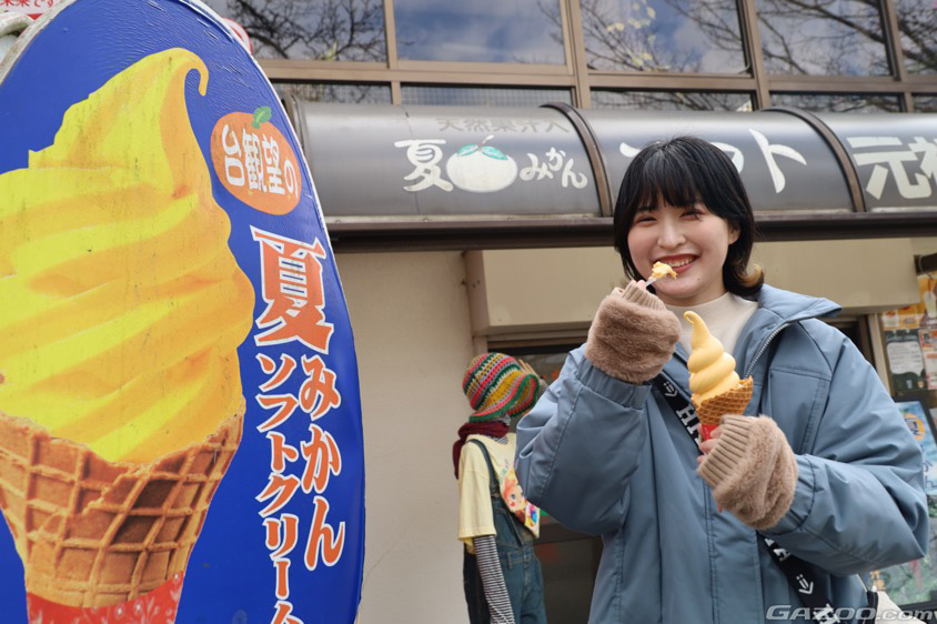 展望台の隣にある『台観望』では、お土産や食事が楽しめるほか、年中用意しているという名物『夏みかんソフトクリーム』も販売。少し肌寒いくらいの気温ではありましたが、取材会スタッフも美味しくいただきました♪