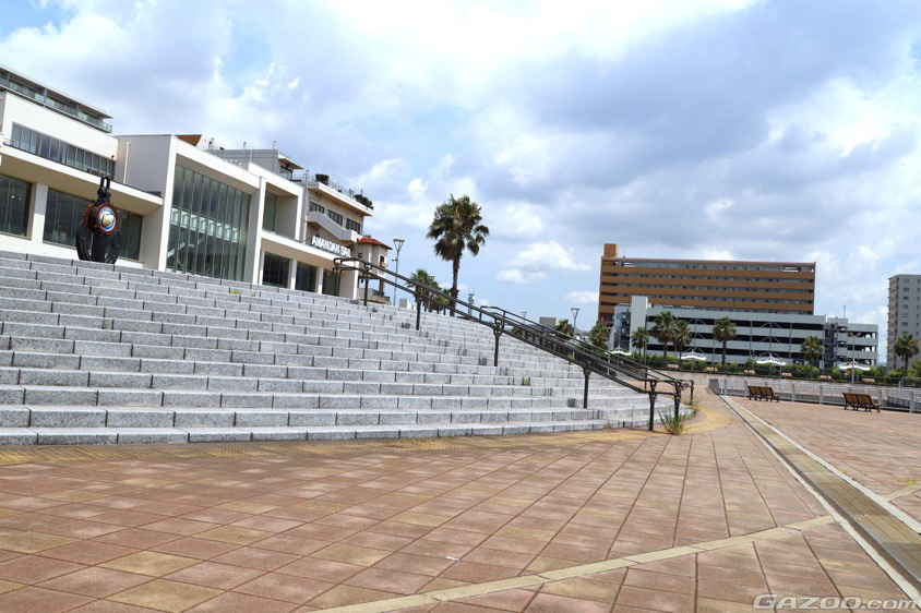 レンガ敷きのプロムナードや上下をつなぐスロープ、階段など、どこを切り取ってもフォトジェニックな『さんばしひろば』。日中はお子様連れのファミリーやサイクリングの休憩に訪れている方が多かったですが、日が傾いてくるとベンチで談笑するカップルの姿なども増えてきて、市民の憩いの場として親しまれていることが感じられました。