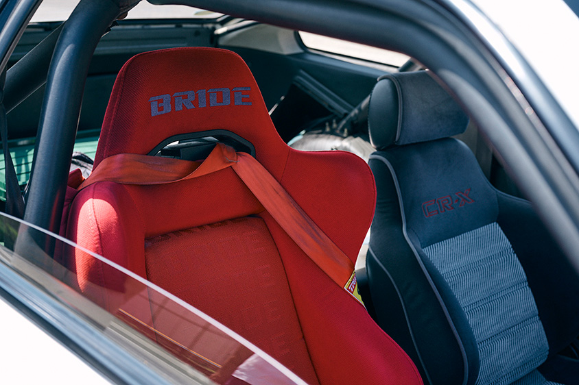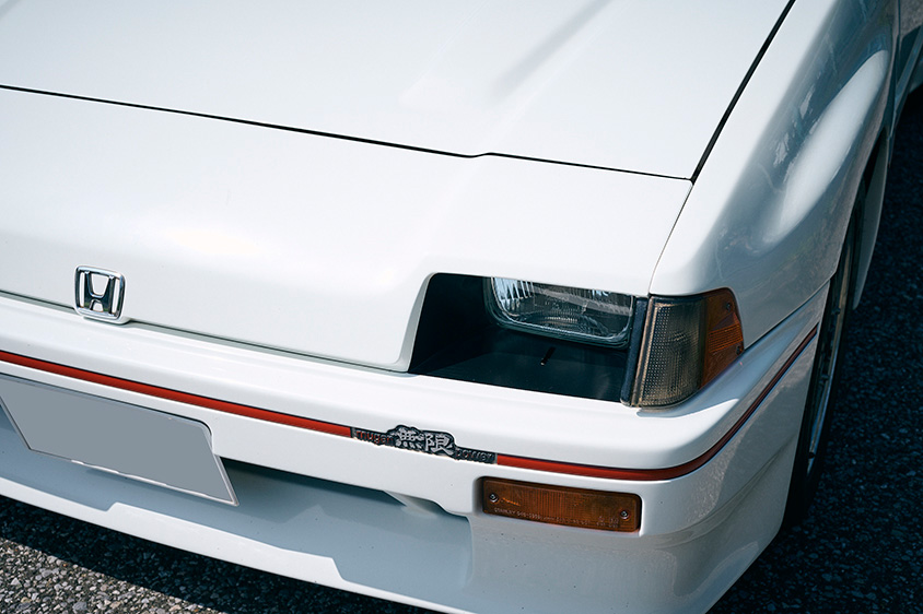 「大学を卒業して社会人になってから最初のボーナスをつぎ込み、無限のフルエアロを組みました。実はこのエアロ、レーシングカーデザイナーである由良拓也氏がデザインを手がけたんです。オーバーフェンダーに注目されることが多いんですが、私としてはフロントマスクがノーマルよりも低く、シャープになっているところがお気に入りです。もともとのボディーカラーは黒/ガンメタのツートンカラーだったんですが、ワイドキットを組み込んだ際に白にオールペイントしました。その他、主なモディファイの箇所は、ジムカーナに挑戦した際にロールケージを組み込みました。それと、無限の15インチアルミホイールなんですが、実はレアな一品ですよ。公認車両なので、正確には“CR-X改”です」