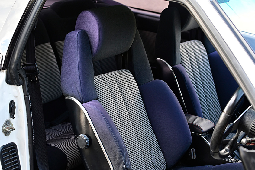 2代目 2000GTはボディカラーが白の場合内装がバーガンディ(ワインレッド)カラーだが、前期の赤い車両に使用されていたこの青内装を総移植。前期と後期で仕様が異なっていたリアシートは旦那様がワンオフで作ってくれたそうだ。
