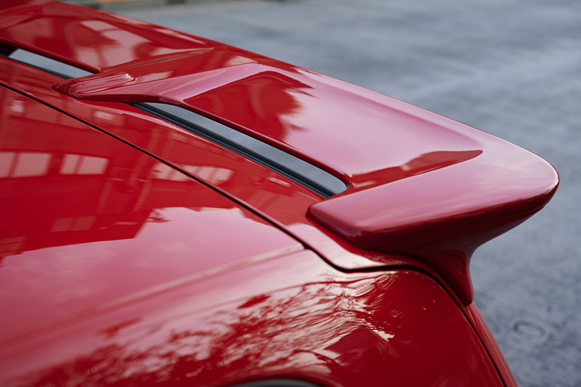「GTI-Rの特徴でもあるボンネットのダクトよりも右後ろからの眺めですね。フォルクスワーゲン ゴルフっぽいところも気に入っています。あとは、GTI-R専用のリアスポイラーですね。リアシートが広い点もお気に入りです。最近のクーペモデルって案外リアの空間が狭いですけど、GTI-Rは大人4人乗っても快適に移動できるんですよ!」