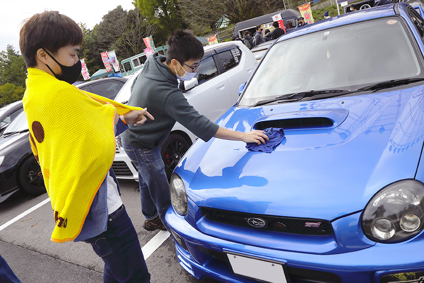そして今回の取材で印象に残ったできごとが、青田さんのクルマが撮影されると知った仲間が、その場でインプレッサの洗車を率先して手伝ってくれていたこと。