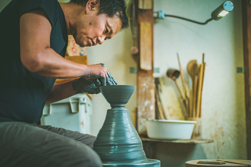 高校卒業と同時に京都へ渡り、長年にわたって陶器と磁器制作の修行を重ね、繊細な茶陶の制作にも従事。そして1998年、32歳のときに自らの工房「卓袱堂」を立ち上げた。