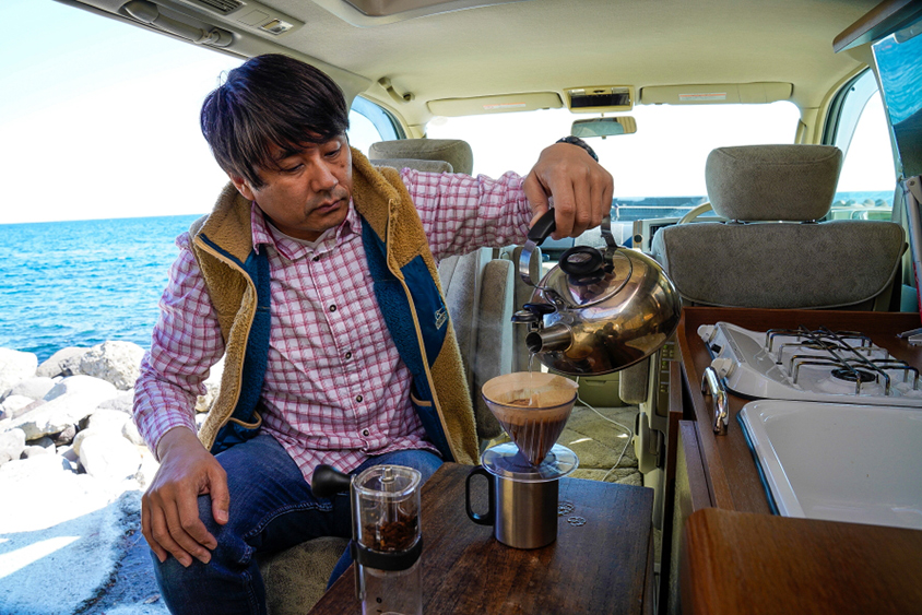 「長期間の旅では取材以外の仕事もしなければなりません。このエルグランドにはAC電源がついているのでPCやカメラの充電は全く問題なし。今はあちこちにWi-Fiがあるからネット環境にも困りませんでした。仕事に疲れたらお湯を沸かしてコーヒーを飲みながら一休みします。その日に移動がなければ道の駅で仕入れた地酒や焼酎を飲むことだってできますから。疲れている時は寝る前に車内を片付けるのも面倒。ポップアップルーフなら車内を片付けなくても気にせず寝られるから便利ですよ」