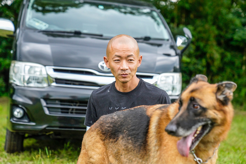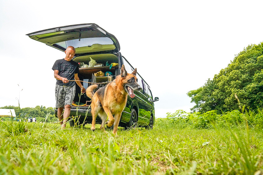 現在の相棒であるぽんすけは、ハイエースに乗り始めてしばらくしてから飼い始めた。犬種は展覧会系のシェパードで、足がスラッと長く、性格がおっとりしているのが特徴だ。
