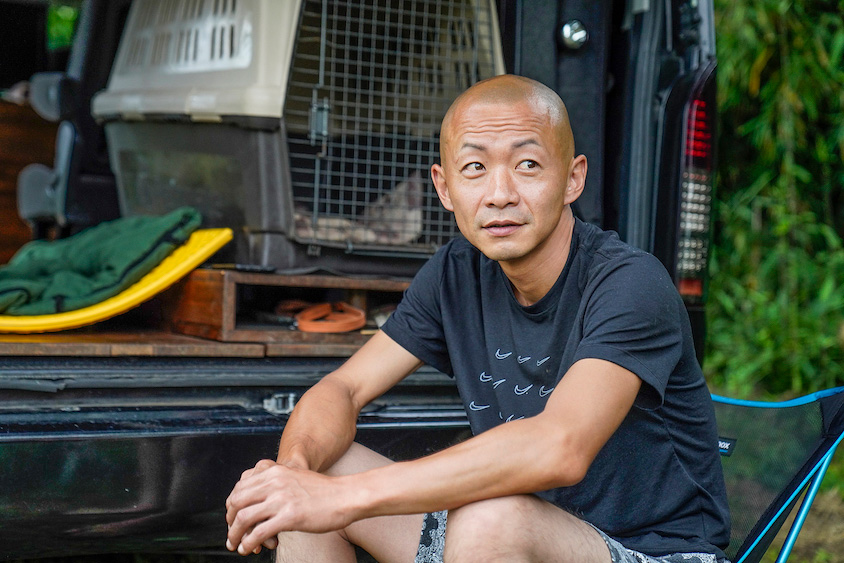 芝生が広がる広大なキャンプ場の隅にクルマを置き、愛犬であるシェパードのぽんすけとのんびり過ごす栗原良介さん。週末はたいてい、都内近郊のキャンプ場にいるという。