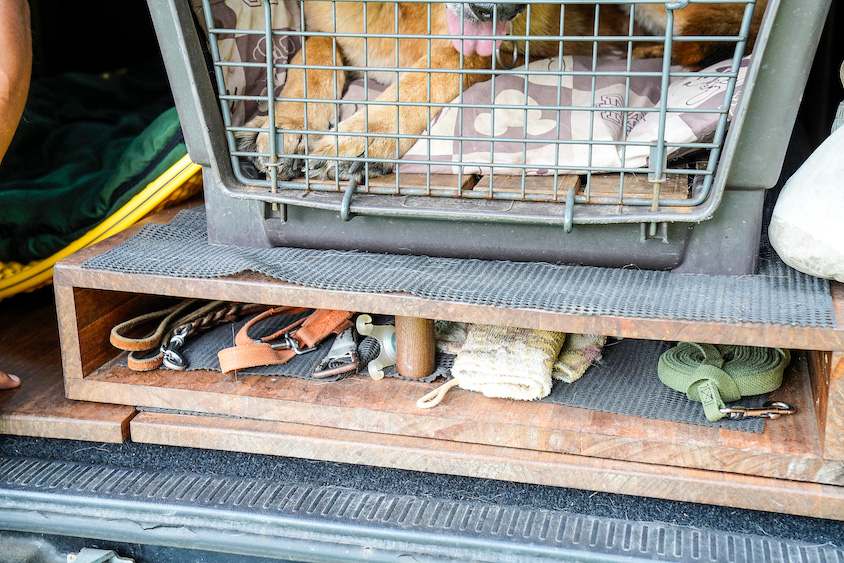 圧倒的な積載性を誇るハイエースだが、標準ボディだと大きなケージを2つ並べることは難しい。ワイドボディなら片方のケージの下に少し板を敷いて左右の高さを変えることで、なんとか並べることができた。