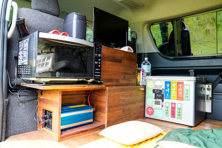 ぽんすけと暮らすようになってからはケージがひとつでよくなったので、一人の時はケージの横に寝袋を敷いて車中泊を楽しむように。すると車内をどれだけ快適にできるかと考えはじめ、サブバッテリーを積んで大型のテレビと電子レンジを設置した。