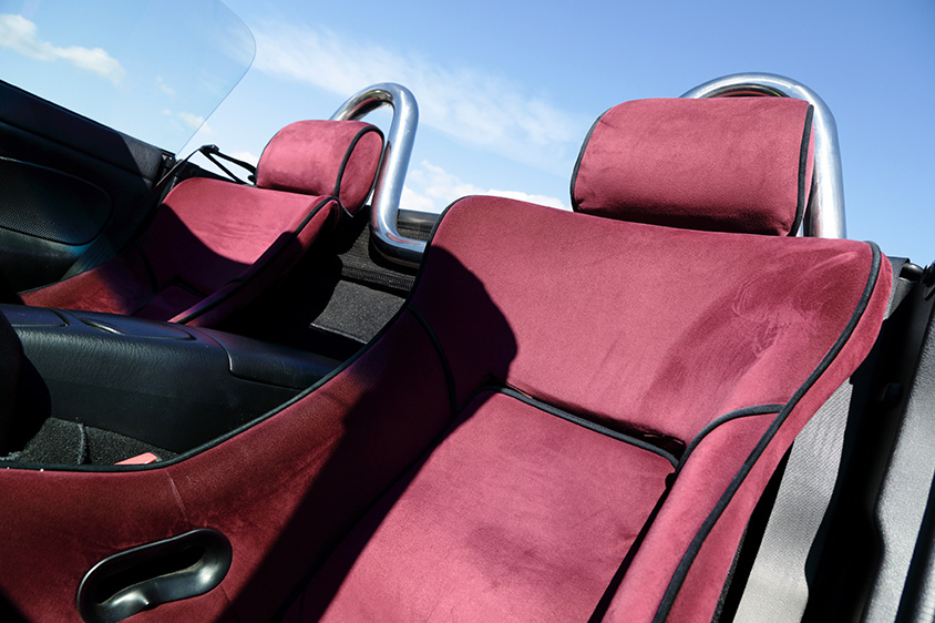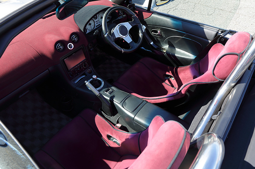シートは、2シーター車向けを中心にアフターパーツを提供しているエスケレート製のタイプNというモデル。ヘッドレスト付きのバケットシートのようなスタイルは、大人の雰囲気とスポーティさを兼ね備えていて、ファブリックをアルカンターラに張り替えることで高級感も醸し出す。