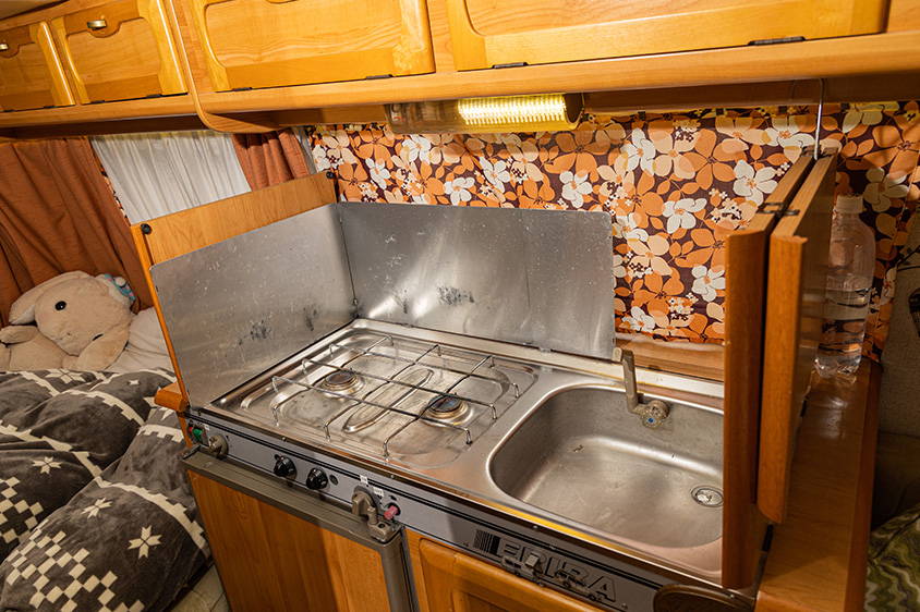 さっそくキャンピングトレーラー内を拝見すると、広めのベッドと、テーブルを囲んだリビングスペース、棚収納、さらに不自由のないキッチンが備わっている。外観はコンパクトだが、車内は十分な広さがあり、屋根の高さが変えられるので大人が立っても余裕がある。とても快適な空間だった。