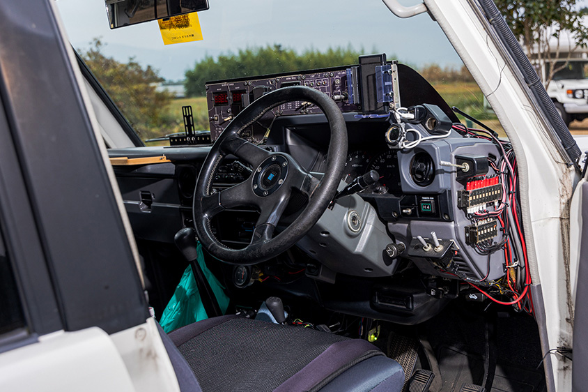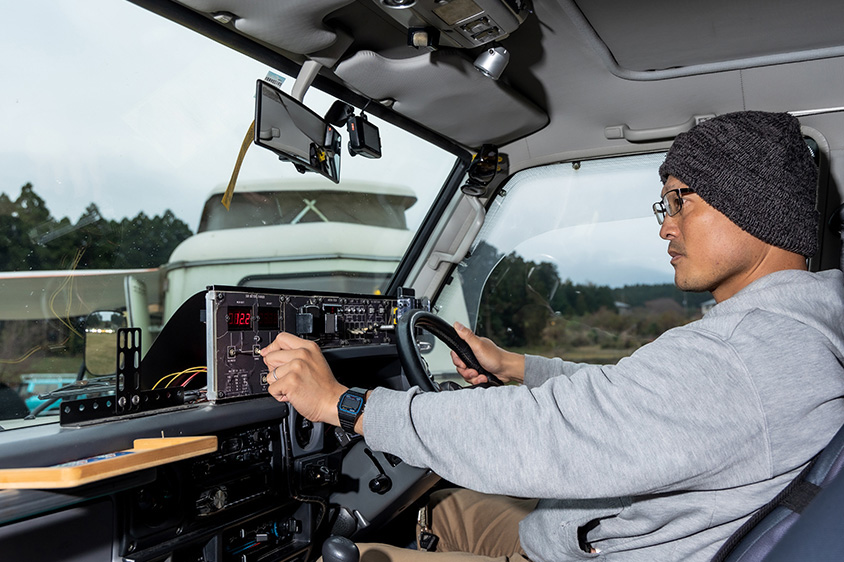 ランクル側のカスタムも、ほとんどは田中さんがDIYで行ってきたもの。トレーラーで使う100V電源を充電するため、ランクルには電圧を100Vに昇圧するコンバーターを装備。メインとサブで2台のバッテリーを使い分けるためのスイッチは、さまざまな回路を追加した航空機のコックピット風の自作パネルにまとめられている。