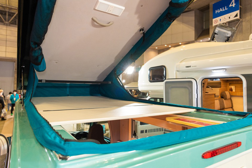 「このクルマは4名乗車8ナンバーのキャンピングカー登録なので、リアシートの横座りができます。寝るときはポップアップルーフ内のベッドに2人、車内のベッドに1人と複数人で車中泊できるようになっています」