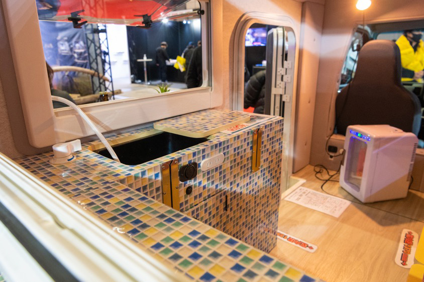 「また室内には水タンクと水道、ミニキッチンもあるし、お水は外でも使用可能です。キッチンテーブルはボディのサイドや後ろに取り付けできるので、外でコーヒーや軽食も楽しめますよね。キャンピングカーってどうしても室内で完結してしまいがちじゃないですか。でも、せっかくなら外でバーベキューを楽しんだりして欲しいなと思っているので、こういう工夫をしているんですよ」