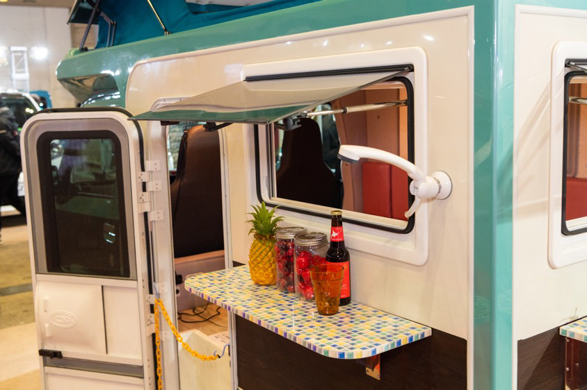 「また室内には水タンクと水道、ミニキッチンもあるし、お水は外でも使用可能です。キッチンテーブルはボディのサイドや後ろに取り付けできるので、外でコーヒーや軽食も楽しめますよね。キャンピングカーってどうしても室内で完結してしまいがちじゃないですか。でも、せっかくなら外でバーベキューを楽しんだりして欲しいなと思っているので、こういう工夫をしているんですよ」
