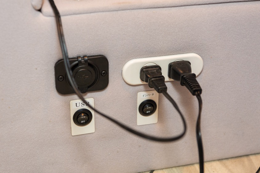 他にも着替えの際などに便利な隠し部屋が作り出せる“マルチカーテン”や、虫の侵入を防ぐ網戸付きのリアドアなど実用的な気配りも抜群。リチウムイオンバッテリーやソーラーパネルによってコンセントとUSBの電源も2箇所ずつ装備しているので家電も不安なく使用できる。