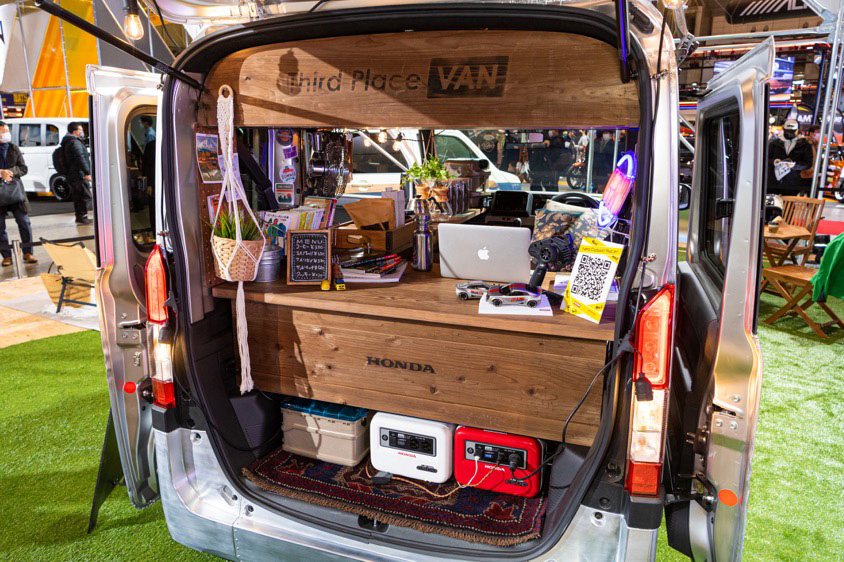 ホンダブースでアウトドア感あふれるスペースに展示されていたのはN-VANとN-WGN。共通するのはそれぞれシンプルでベーシックな素性の良さを持つ軽自動車であり、カスタムすると個性を生かした世界観を自分で作ることができる拡張性も持っているという点だ。
