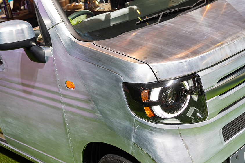 まずはステンレスの風合いが目を惹くボディにキッチンカーのような内装カスタムが施されたN-VANカスタム。