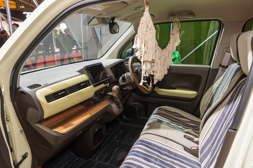 「鉄板やガラスなど元のボディは一切イジらずに、アフターパーツとして追加できるコンセプトを表現しています。エクステリアはライト類やグリルなどに優しく楽しい印象を与える丸いパーツを多用し、インテリアもダッシュボードはホンダアクセスとしてもともとあるアイテムの素材感を変えたものです。