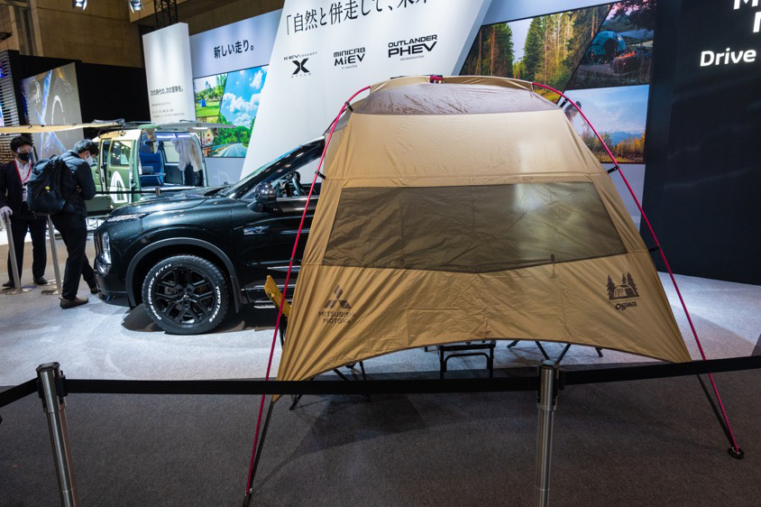 最初に目を引いたのはクロスオーバーSUVアウトランダー『OUTLANDER Wild Adventure Style』。なんと、1914年創業の老舗アウトドアブランド『ogawa』とコラボレーションした『キャンピングパッケージ』を純正アクセサリーとして製品化しているのだ。