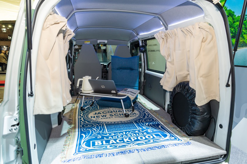 軽商用EVのミニキャブ・ミーブ『MiniCAB MiEV B-Leisure Style』は、EVならではの機能を活用し、パソコンやケトルなどを使いながら部屋で仕事しているような感覚で使えるというイメージを具現化。もともとフラットなフロアにクッションを敷き、カーテンなども装着することで快適性を高めるなど、ユーザーが使い方をイメージしやすいような展示となっていた。