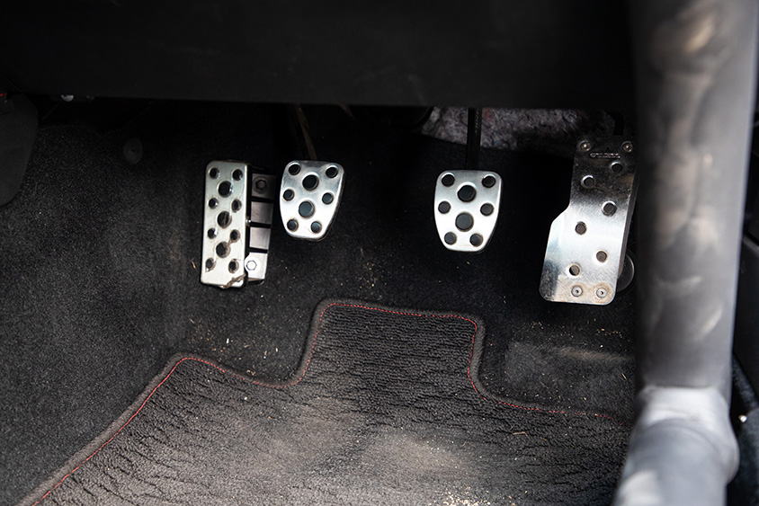 その一方、内装はフルバケットシートに6点式のシートベルト、そして6点式ロールバーとサーキット走行に必要な機能パーツを採用。ただサーキット走行車両にはほぼ搭載される4連メーターは「同じクルマの社長があれだけ回転あげても問題ないのだから、そこまで回せない自分のクルマがダメになるはずはない」と未装着のままだ。