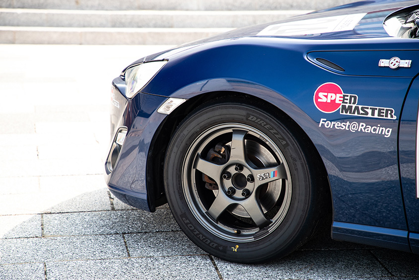 「純正サイズは17インチなんですが、レースのレギュレーションが16インチなのでサーキットではこのSSRホイールに205/55-16サイズを履いて4輪をローテーションしています。16インチホイールはブレーキローターが綺麗におさまるし、乗り心地もよい上にタイヤも17インチに比べれば1本5000円くらい安いので良いことしかありません」