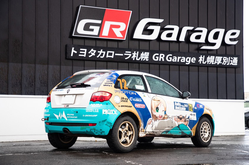 宮坂さんが愛車として乗るサトリアネオは、全日本ラリー選手権で2012〜2013年シーズンに『CUSCO Jr RALLY TEAM』が使用していたうちの1台。グラフィックのモチーフになっているのは、クスコジュニアラリーチームのマスコットキャラクターである山の神の『高崎くす子』を祀る神社の娘という設定の『佐藤りあ』というキャラクター。まさにサトリアの車名がモチーフになっている『佐藤りあ』をボディの左右に大きく配置し、衣装と共通のカラーリングが施されている当時のグラフィックは変更することなく、そのままの状態を維持している。