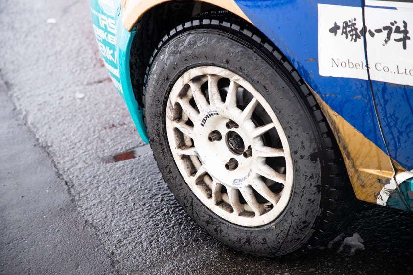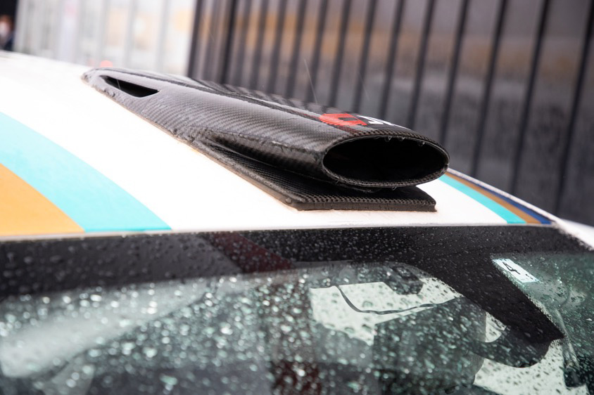 足元には軽量高剛性が特徴だというエンケイスポーツ製15インチホイールを履かせ臨戦態勢といった雰囲気。室内に快適なフレッシュエアを取り入れるためのダクト(ルーフベンチレーション)も競技車両ならではだ。