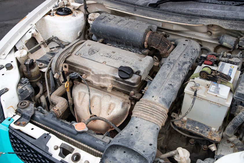 外観と同じく歴戦の跡がうかがえるエンジンルームには、レギュレーションに適合するためノーマル状態をキープした1.6Lの直列4気筒自然吸気エンジンが搭載されている。